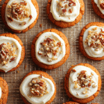 Carrot cake cookies topped with cream cheese frosting and chopped pecans, arranged on a cooling rack